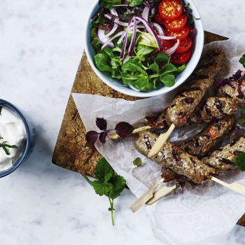 Hak de knoflook fijn. Meng alle ingrediënten in een grote kom met 1 el. zout en ½ theelepel peper. Gebruik je handen om alles samen te mixen tot het mengsel kleverig is. Bedek met afdekfolie en plaats ongeveer 30 minuten in de koelkast. Verwarm een barbecue of een pan. Rol het vlees in worstvormige vormen die ongeveer 10 cm lang en 3 cm dik zijn. Doe ze op de prikkers. Smeer het vlees in met olijfolie en grill ongeveer 6 minuten aan elke kant of tot het goed gaar zijn. Draai de spiesjes regelmatig. Direct serveren met pitabrood, Nicolas Vahé Pesto met Tomaat en Olijf en een beetje yoghurt.
